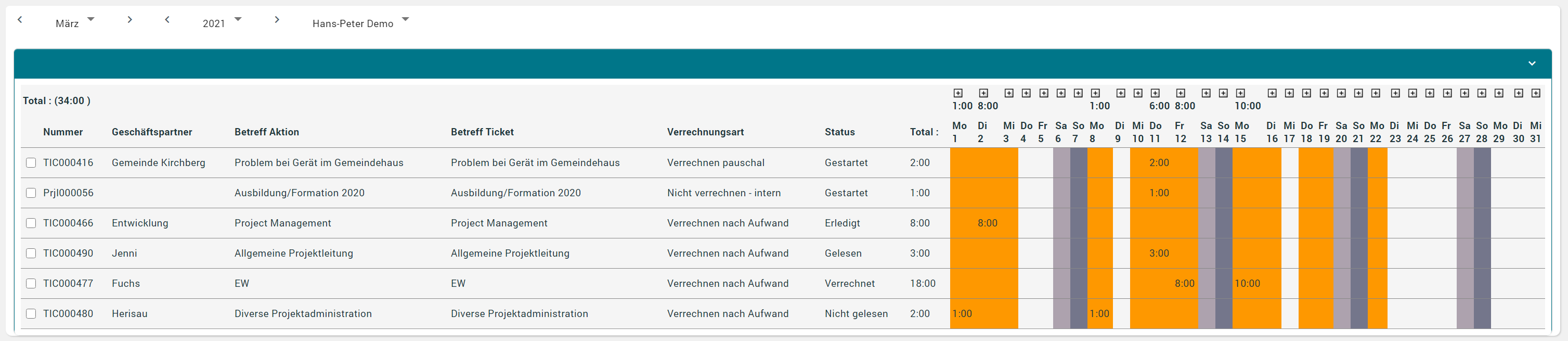 Am jeweiligen Tag, oder auch einmal pro Woche, wird im gleichen Fenster das Kommen/Gehen abgefüllt und die daraus resultierenden Stunden (Leistungserfassung) auf die aktuellen Arbeiten/Aufträge verteilt/erfasst. Dies ermöglicht dem Anwender eine sehr effiziente Art der Zeiterfassung seiner geleisteten Arbeiten. Wenn also nach Erfassen dieser Leistungen auch die Absenzen im Kalender eingetragen werden, ergibt sich ein lückenloses Gleitzeitsaldo für jeden Mitarbeiter. Die Software zur Leistungserfassung ermöglicht es zugleich, auch immer in der tabellarischen Übersicht (Monatsansicht) darzustellen wann, wie viel und für wen gearbeitet wurde. So können Sie auch einen monatlichen Report an die Personalbateilen senden inklusive aller Zeiten, Spesen etc. Die abgeschlossenen Arbeiten gehen, wenn sie verrechnbar und abgeschlossen sind, automatisch in den monatlichen Rechnungslauf. Diese Generierung aller Rechnungen kann optional auch automatisiert erstellt werden.