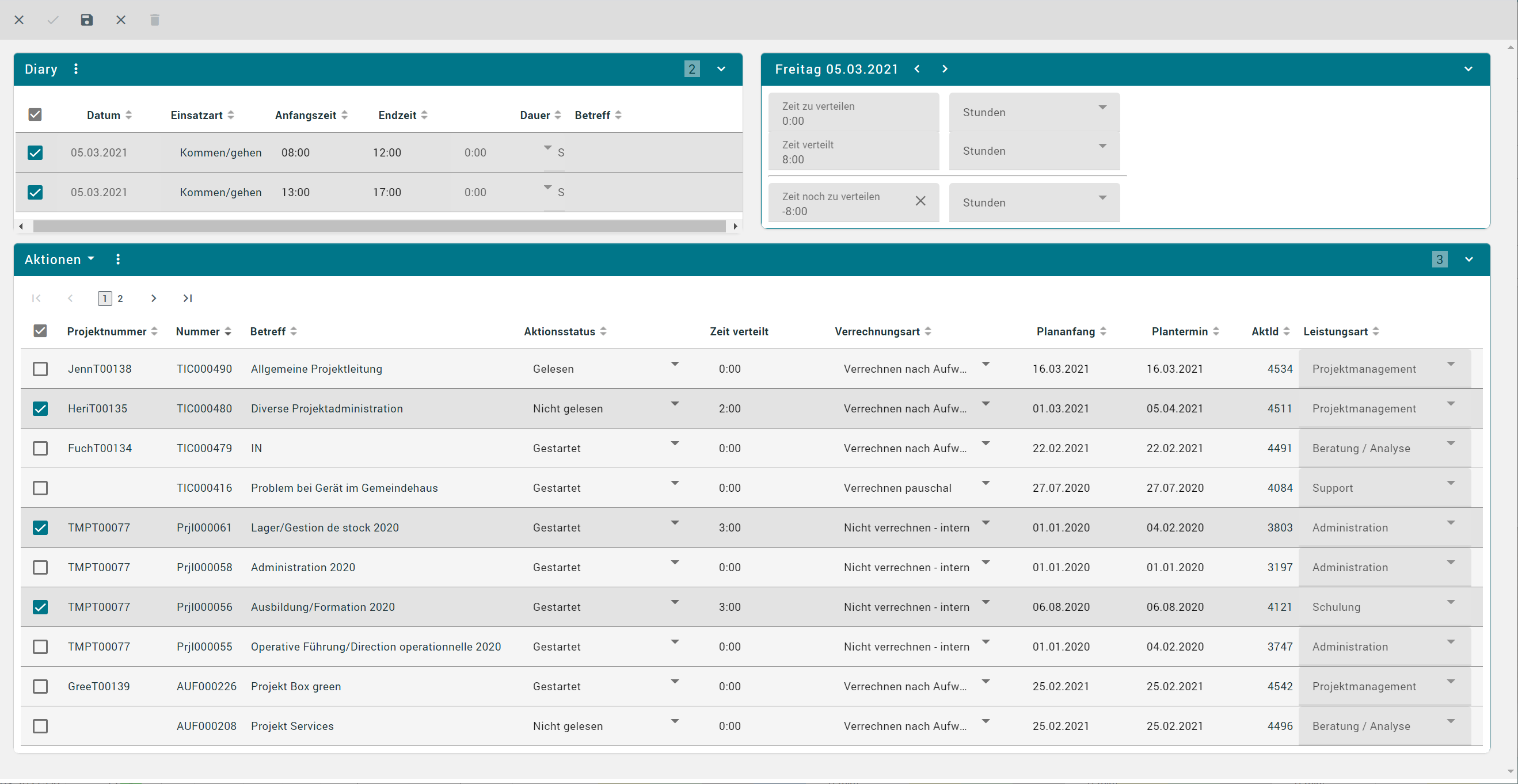 Die Actricity ERP Software stellt dem Dienstleister eine Leistungserfassung PZE, oder auch Zeitrückmeldung genannt zur Verfügung, die über sämtliche Prozesse im ERP System genutzt werden kann. So können Zeiten und Spesen auf Service-Aufträgen oder Kunden-Projekten sowie Vertriebsaktivitäten und natürlich auch auf interne Tätigkeiten gemeldet werden. Dies vom lokalen PC aus, oder auch mit dem Smartphone, sowie Tablet über die mobile Applikation. Optional besteht auch die Möglichkeit nur die Zeiten auf den verschiedenen Arbeiten zu erfassen ohne das Kommen/Gehen abzufüllen.